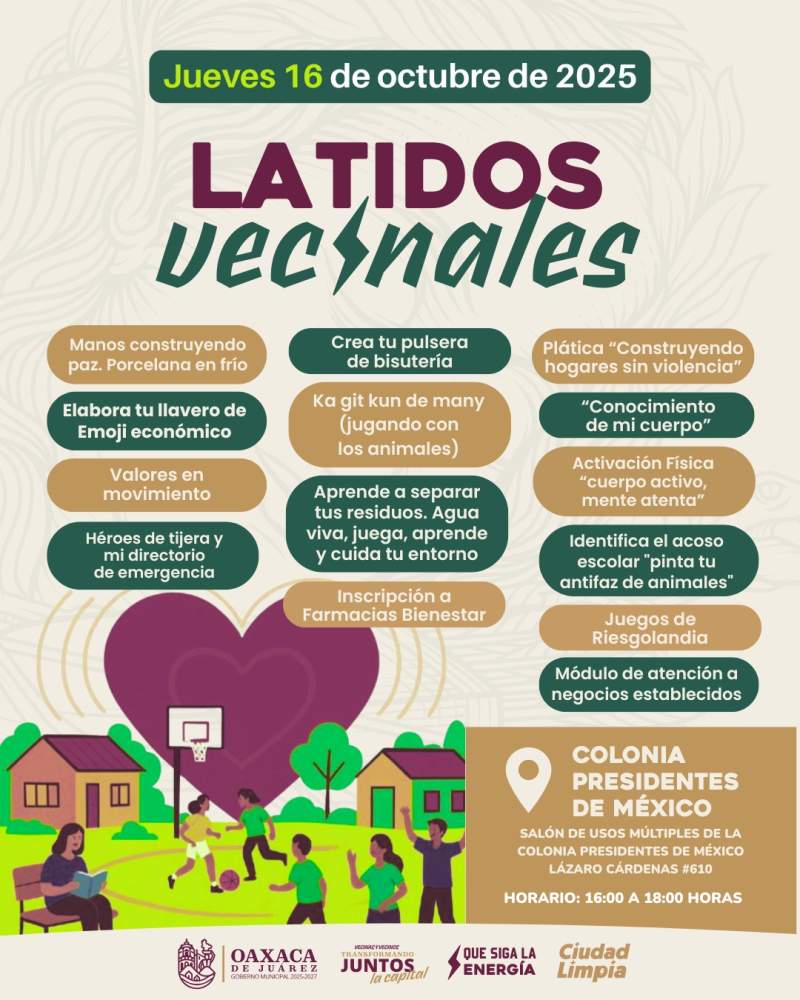 Oaxaca de Juárez, Oax., 16 de octubre de 2025.– El corazón de Oaxaca de Juárez, sigue latiendo con fuerza. A través del programa Latidos Vecinales, el Gobierno Municipal encabezado por Ray Chagoya promueve la unión, el diálogo y la reconstrucción del tejido social con actividades que transforman espacios y fortalecen la convivencia entre familias.