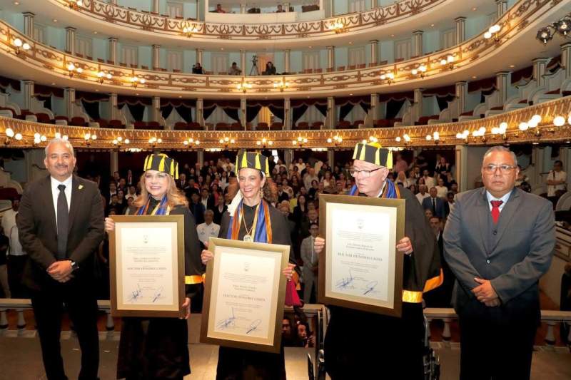 Oaxaca de Juárez, Oax., 5 de noviembre de 2025.— En una ceremonia solemne celebrada en el Teatro Macedonio Alcalá, la Universidad Autónoma “Benito Juárez” de Oaxaca (UABJO) entregó el Doctorado Honoris Causa a la Dra. María Isabel Grañén Porrúa, la Dra. Carmen Enedina Rodríguez Armenta y el Mtro. David Rogelio Colmenares Páramo, por sus aportaciones sobresalientes en los ámbitos académico, cultural y de la administración pública.
