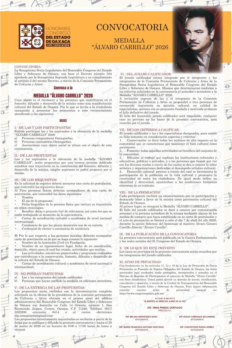 San Raymundo Jalpan, Oax., 13 de febrero de 2026.-* La LXVI Legislatura del Congreso del Estado emitió la convocatoria para participar en el proceso de postulación a la Medalla “Álvaro Carrillo” 2026, con el objetivo de reconocer a quienes, por su trayectoria y aportaciones, han fortalecido la música como una manifestación cultural de identidad y patrimonio del pueblo oaxaqueño.