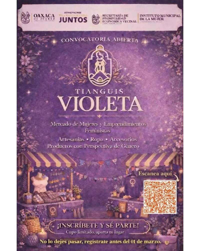 Oaxaca de Juárez, Oax., a 26 de febrero de 2026.- El Instituto Municipal de la Mujer, en coordinación con la Secretaría de Prosperidad Económica Vecinal del Municipio de Oaxaca de Juárez, emite la convocatoria para participar en la Segunda Edición del Tianguis Violeta, dirigida a mujeres emprendedoras de la capital.