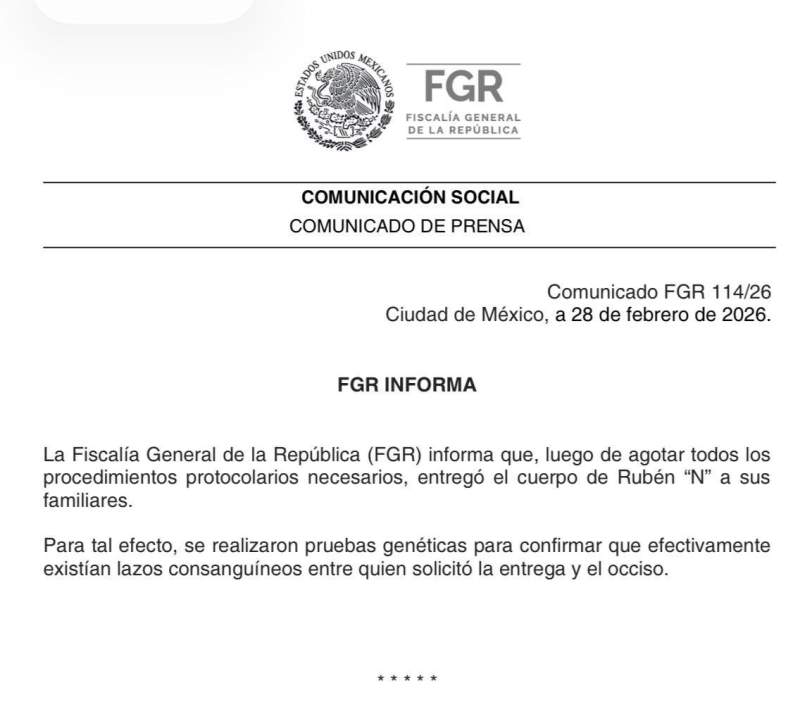 La Fiscalía General de la República informó oficialmente este sábado 28 de febrero que concluyó el proceso legal para entregar los restos de Rubén Nemesio Oseguera Cervantes —identificado como ‘El Mencho’— a su familia. El cuerpo salió del Centro Federal de Investigación Forense en la Ciudad de México alrededor del mediodía, escoltado por carrozas fúnebres y bajo fuerte resguardo de elementos federales. Dos vehículos funerarios ingresaron por la mañana y salieron horas después con custodia policial.