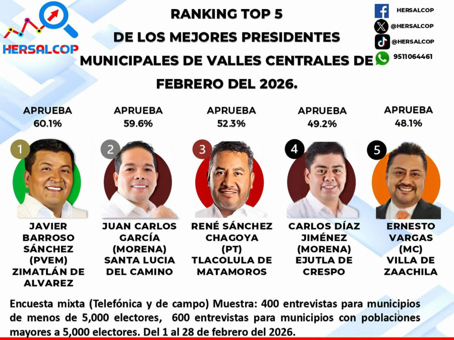 De acuerdo con la más reciente encuesta de Hersalcop, Juan Carlos García Márquez se coloca en segundo lugar entre los presidentes municipales de la región de los Valles Centrales de Oaxaca, con una aprobación ciudadana de 59.6%.