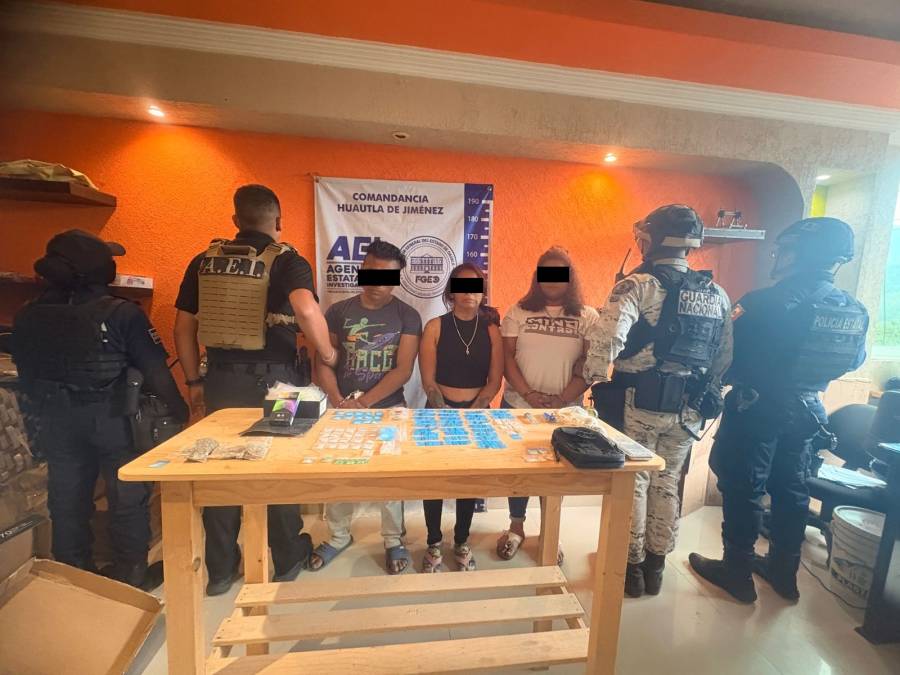 Oaxaca de Juárez, Oax., 24 de marzo de 2026.- Resultado de acciones operativas en la región Sierra de Flores Magón, la Fiscalía General del Estado de Oaxaca (FGEO) ejecutó una orden de cateo que permitió la identificación de un punto de venta de drogas donde se logró la detención de tres personas, un hombre identificado como J.I.G.C., así como dos mujeres: G.N.G.C. y C.L.O.F., además del aseguramiento de diversas dosis de droga.