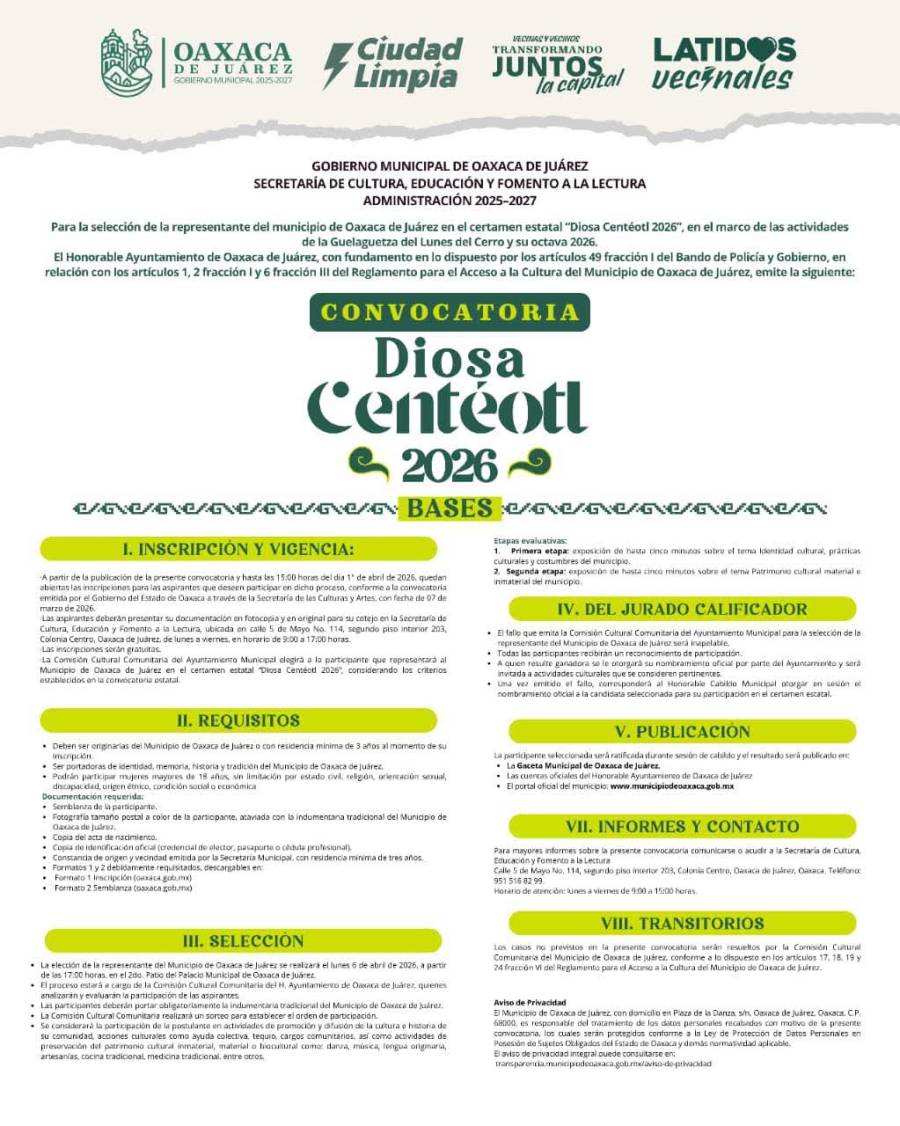 Oaxaca de Juárez, Oax. 24 de marzo de 2026.- El Municipio de Oaxaca de Juárez, a través de la Secretaría de Cultura, Educación y Fomento a la Lectura, lanzó la convocatoria para participar en el proceso de selección de la representante del municipio en el certamen estatal “Diosa Centéotl 2026”, en el marco de la Guelaguetza.