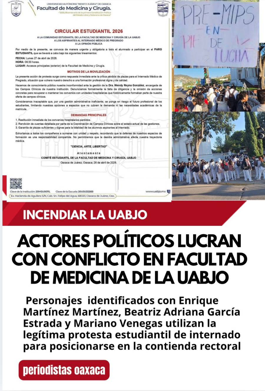 Oaxaca de Juárez, Oax., 27 de abril de 2026.– En el proceso electoral rectoral de la Universidad Autónoma Benito Juárez de Oaxaca (UABJO), con registro de candidatos el 30 de abril y elección el 13 de mayo, actores identificados como Enrique Martínez Martínez, Beatriz Adriana García Estrada y Mariano Venegas utilizan la protesta estudiantil sobre espacios de Internado Médico de Pregrado para posicionarse en la contienda.