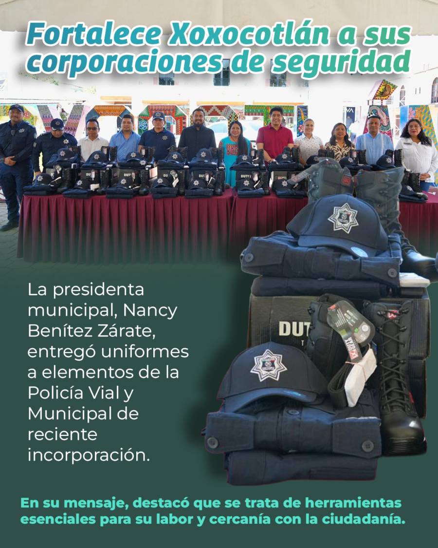 Este jueves, la presidenta municipal de Santa Cruz Xoxocotlán, Nancy Benítez Zárate, entregó de forma simbólica paquetes de uniformes a elementos de la Policía Vial y Municipal de reciente incorporación.